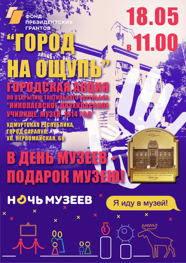 В пятницу, 18 мая 2018 г., — накануне акции «Ночь в Музее», в городе Сарапуле Удмуртской Республики пройдет акция по открытию Тактильного барельефа «Историко-краеведческий музей» (Удмуртская Республика, г. Сарапул, ул. Первомайская, д. 68) изготовленного по заказу ГНОО «Ассоциация родителей детей-инвалидов» на средства Фонда президентских грантов в рамках реализации проекта «Город на ощупь».